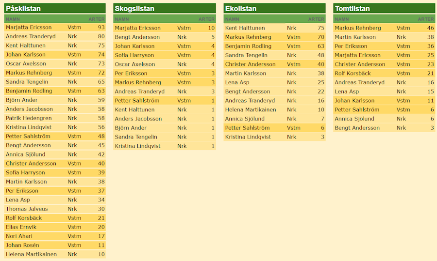 Även om deltagarantalet är lite lägre än tidigare år glädjer det att fler hoppat in i rallyt trots aprilvädret. Det visar sig också i fågellistorna där båda landskapen nu klivit över 100 arter. Närke leder fortfarande med 14 deltagare och 113 arter mot Västmanlands 12 deltagare och 107 arter. Tittar vi på Artportalen så finns det dock potential att öka på för båda landskapen. Arter som inte är med i rallyt finns rapporterade både i Västmanland och Närke.