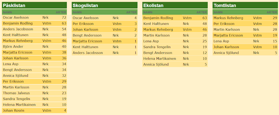 Oscar Axelsson från Närke är den skådare som varit flitigast med 72 arter under skärtorsdagen. Närmast under hittar vi Benjamin Rodling från Västmanland med 63 arter.
